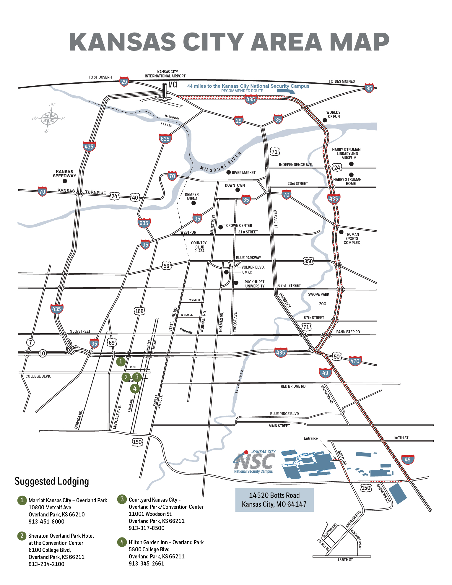 It is highly recommended to get a rental car for the duration of your stay in Kansas City. While ride share companies are available, they often have difficulty locating the Kansas City National Security Campus main building and can delay your arrival or departure.